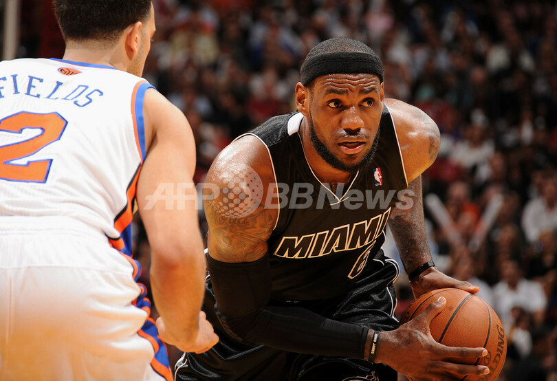 ニックスのランドリー・フィールズ(Landry Fields)とマッチアップするヒートのレブロン・ジェームズ(LeBron James、2012年2月23日撮影)。(c)AFP/Getty Images/NBAE/Andrew D. Bernstein
