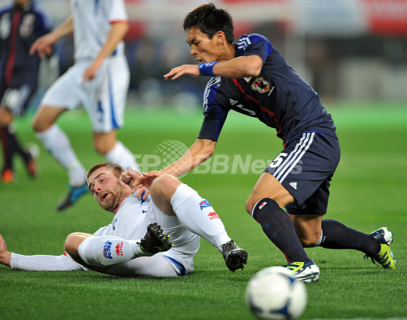 アイスランドのグズムンドゥル・クリスチャンソン(Guomundur Kristjansson、左)との接触でバランスを崩す日本の槙野智章(Tomoaki Makino、2012年2月24日撮影)。(c)AFP/KAZUHIRO NOGI