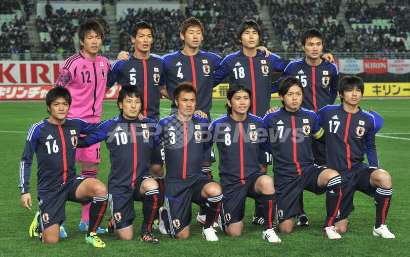 試合前の写真撮影に臨む日本代表の選手(2012年2月24日撮影)。(c)AFP/KAZUHIRO NOGI