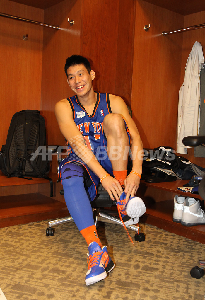 ロッカーで試合開始に備えるチーム・シャックのジェレミー・リン(Jeremy Lin、2012年2月24日撮影)。(c)AFP/Getty Images/NBAE/Kent Smith