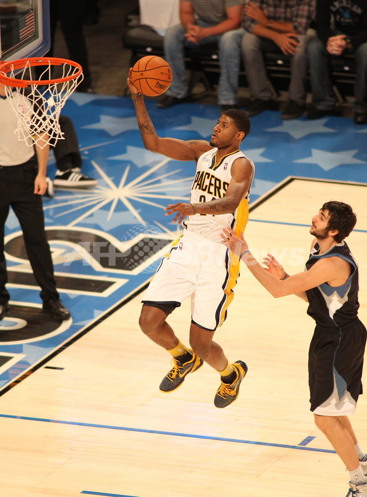 レイアップシュートを狙うチーム・チャックのポール・ジョージ(Paul George、2012年2月24日撮影)。(c)AFP/Getty Images/NBAE/Kent Smith