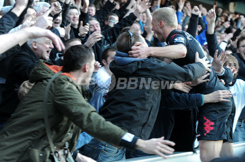 前半7分に先制点を挙げ、サポーターと抱き合って歓喜するフラムのパベル・ポグレブニャク(Pavel Pogrebnyak、2012年2月25日撮影)。(c)AFP/CARL COURT