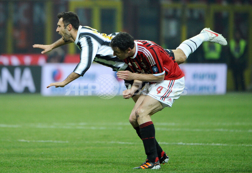 ACミランのマルク・ファン・ボメル(Mark Van Bommel、右)とボールを競るユベントスのミルコ・ブチニッチ(Mirko Vucinic、2012年2月25日撮影)。(c)AFP/OLIVIER MORIN