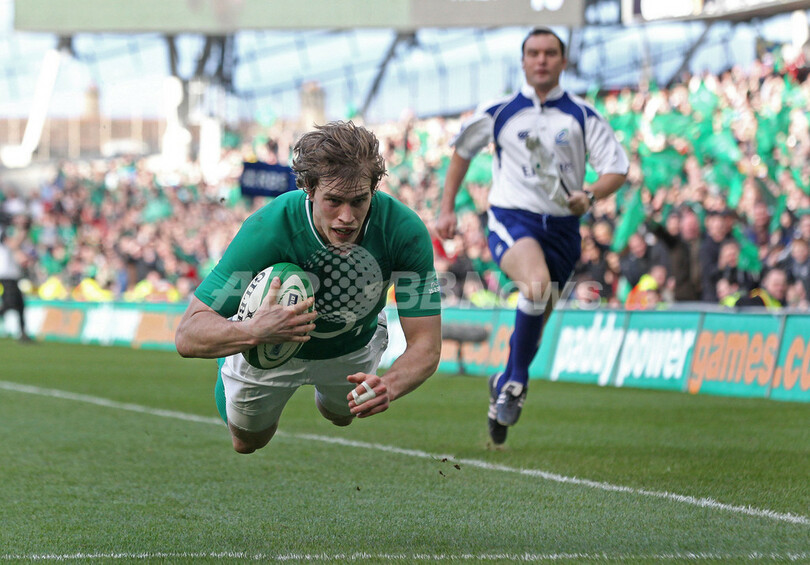 トライを決めるアイルランドのアンドリュー・トリンブル(Andrew Trimble、左、2012年2月25日撮影)。(c)AFP/PETER MUHLY