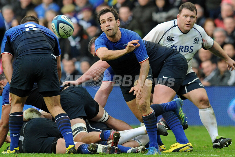 パスを出すフランスのモーガン・パラ(Morgan Parra、中央、2012年2月26日撮影)。(c)AFP/FRANCK FIFE
