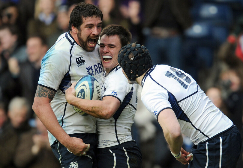 トライを決め、チームメイトに祝福されるスコットランドのリー・ジョーンズ(Lee Jones、中央、2012年2月26日撮影)。(c)AFP/FRANCK FIFE
