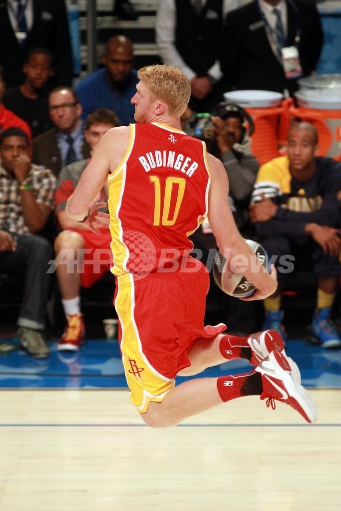 スプライト・スラムダンクコンテスト(2012 Sprite Slam Dunk contest)に出場したヒューストン・ロケッツ(Houston Rockets)のチェイス・ブディンガー(Chase Budinger、2012年2月25日撮影)。(c)AFP/Getty Images/Ronald Martinez