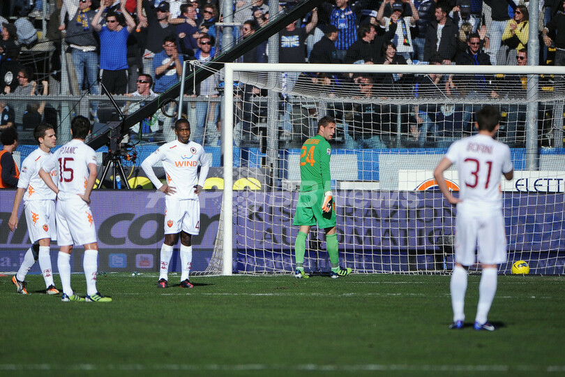 前半19分にアタランタのヘルマン・デニス(German Gustavo Denis)に追加点を奪われ、落胆するASローマの選手(2012年2月26日撮影)。(c)AFP/OLIVIER MORIN