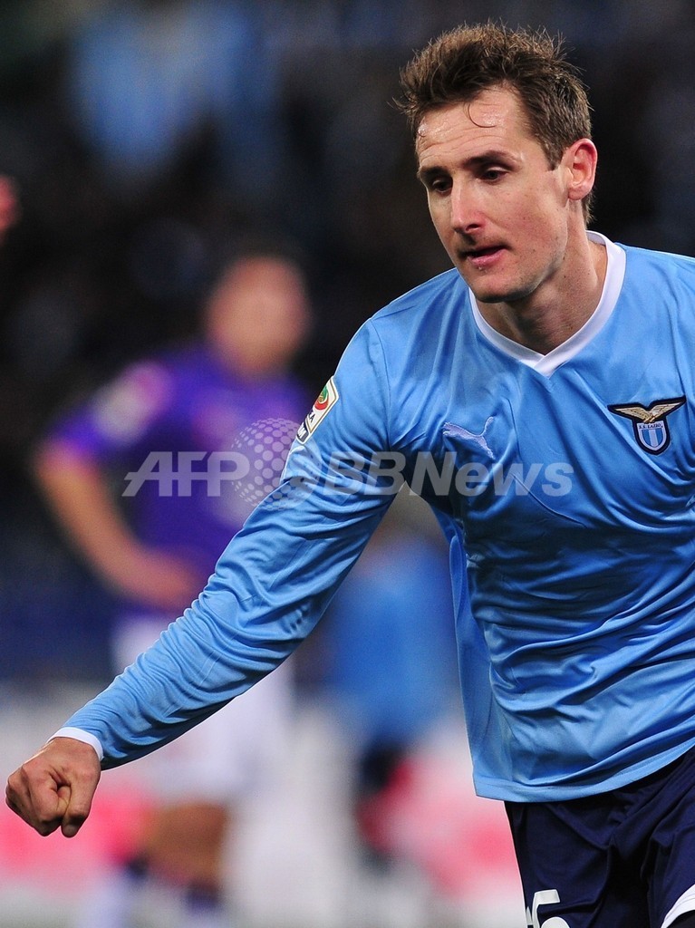 前半35分に先制点を挙げ、歓喜するラツィオのミロスラフ・クローゼ(Miroslav Klose、左、2012年2月26日撮影)。(c)AFP/ALBERTO PIZZOLI