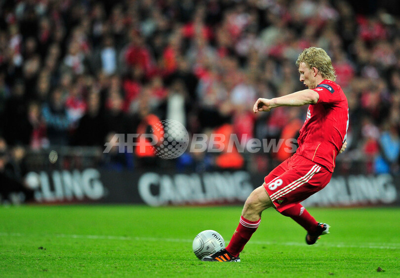 PK戦でシュートを決めるリバプールのディルク・カイト(Dirk Kuyt、2012年2月26日撮影)。(c)AFP/GLYN KIRK