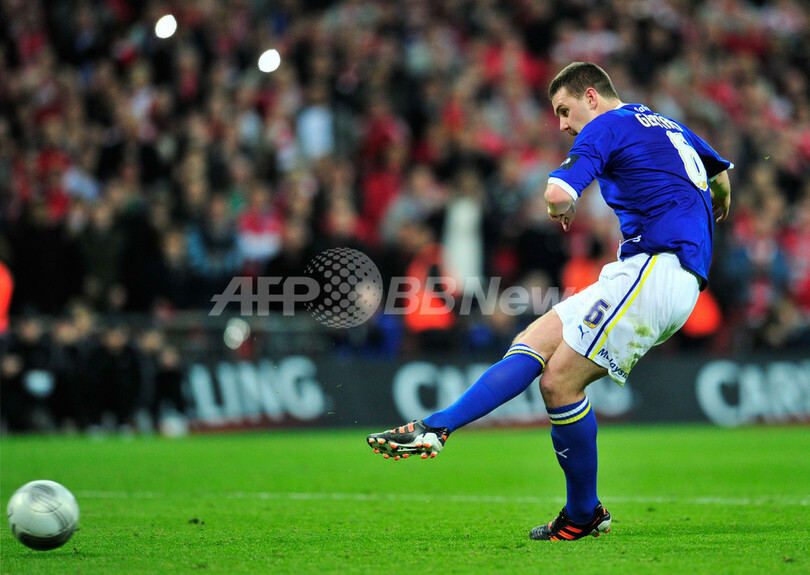 PK戦でシュートを放つカーディフのアンソニー・ジェラード(Anthony Gerrard、2012年2月26日撮影)。(c)AFP/GLYN KIRK