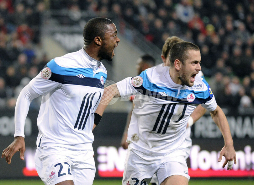 前半40分に先制点を挙げチームメイトのジョー・コール(Joe Cole、右)と歓喜するリールのオーレリアン・シェジュ(Aurelien Chedjou、2012年2月26日撮影)。(c)AFP/DAMIEN MEYER