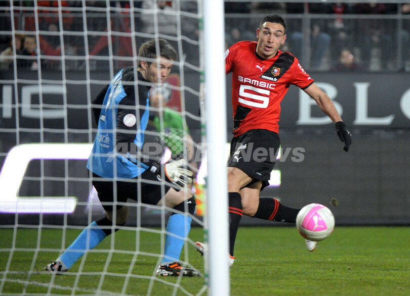 後半45分にゴールを決めるレンヌのメヴリュト・エルディング(Mevlut Erding、右、2012年2月26日撮影)。(c)AFP/DAMIEN MEYER