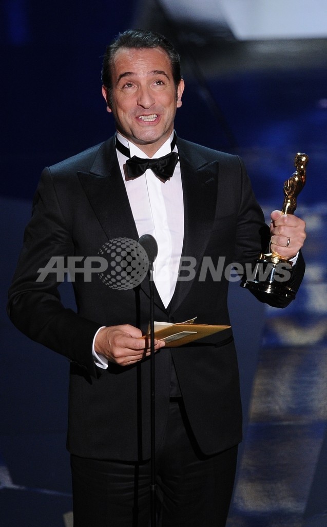 米ハリウッド(Hollywood)で26日開催された第84回アカデミー賞(Academy Awards)授賞式で、主演男優賞の受賞スピーチをするジャン・デュジャルダン(Jean Dujardin、2012年2月26日撮影)。(c)AFP/Robyn BECK