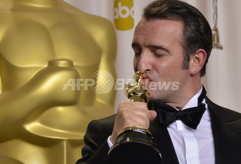 米ハリウッド(Hollywood)で26日開催された第84回アカデミー賞(Academy Awards)授賞式で主演男優賞を受賞し、オスカー像にキスをするジャン・デュジャルダン(Jean Dujardin、2012年2月26日撮影)。(c)AFP/Joe KLAMAR
