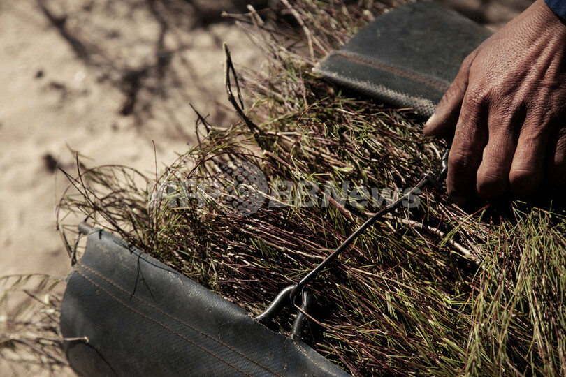 【2月29日 AFP】南アフリカ・西ケープ(Western Cape)州の農園。赤く茂ったルイボスの枝を農場労働者たちが鎌で刈り取っていき、日なたに並べて乾燥させる。