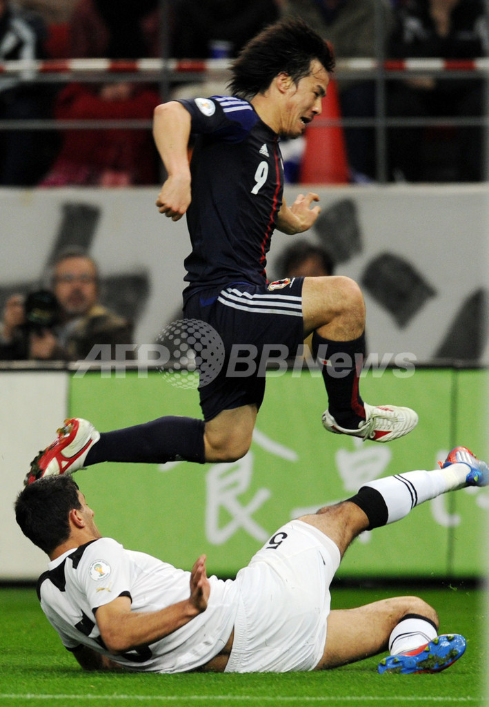 ウズベキスタンのアルチョム・フィリポシャン(Artyom Filiposyan)のスライディングタックルを受ける岡崎慎司(Okazaki Shinji、2012年2月29日撮影)。(c)AFP/TOSHIFUMI KITAMURA