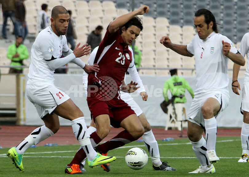 イランのアシュカン・デヤガ(Ashkan Dejagah)とアリ・カリミ(Ali Karimi)に囲まれるカタールのセバスティアン・ソリア(Sebastian Soria、2012年2月29日撮影)。(c)AFP/ATTA KENARE