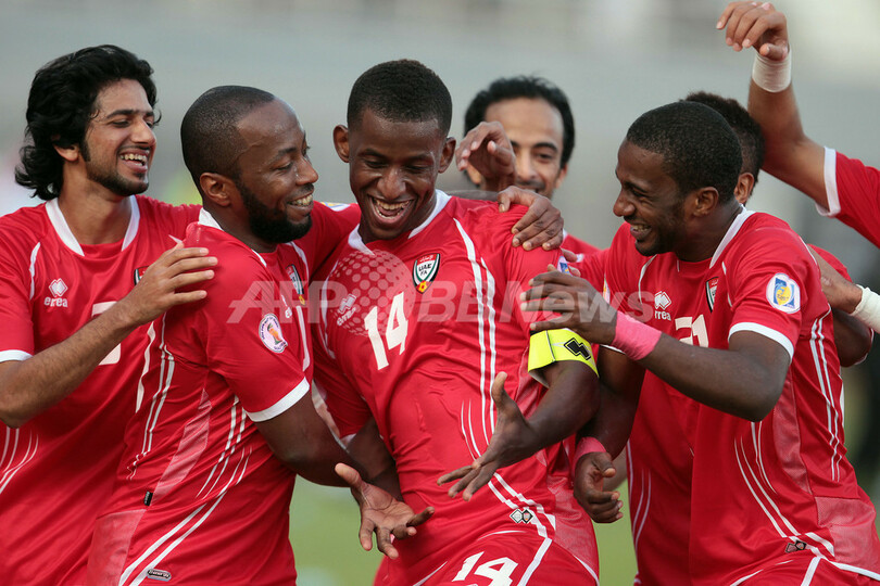 チームの得点に歓喜するUAEの選手(2012年2月29日撮影)。(c)AFP/JOSEPH CAPELLAN