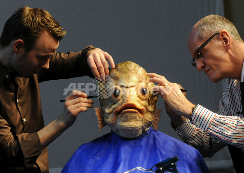【3月2日 AFP】ドイツ西部デュッセルドルフ(Duesseldorf)で間もなく、特殊メイクの見本市「メーキャップアーティスト・デザインショー2012(Make-up Artist Design Show)」が開催される。1日に行われた記者会見では、テナー歌手のフロリアン・シムソン(Florian Simson)氏が特殊メイクを施され、鯉(コイ)に変身する様子が披露された。(c)AFP
