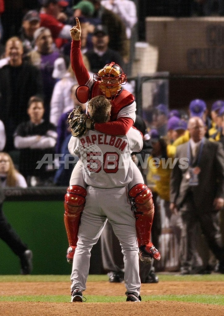 07MLBワールドシリーズ第4戦、コロラド・ロッキーズ(Colorado Rockies)戦でワールドチャンピオンに輝き、救援投手のジョナサン・パベルボン(Jonathan Papelbon、手前)に抱きついて喜ぶボストン・レッドソックスのジェイソン・バリテック(Jason Varitek、2007年10月28日撮影)。(c)AFP/Getty Images/Stephen Dunn