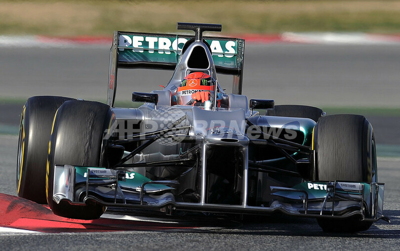 テスト走行で8番手となるベストラップ1分23秒978(79周)を記録したメルセデスAMG(Mercedes AMG)のミハエル・シューマッハ(Michael Schumacher、2012年3月2日撮影)。(c)AFP/LLUIS GENE