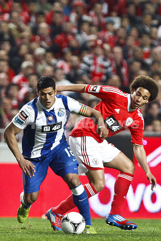 ボールを競るFCポルトのフッキ(Hulk)とベンフィカのアクセル・ヴィツェル(Axel Witsel、2012年3月2日撮影)。(c)AFP/PATRICIA DE MELO MOREIRA