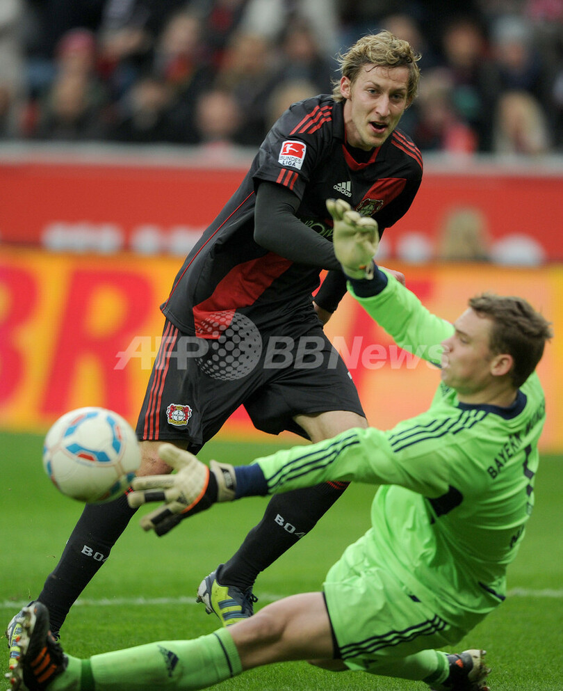 バイエルン・ミュンヘンのGKマヌエル・ノイアー(Manuel Neuer)に得点機を阻まれるバイヤー・レバークーゼンのステファン・キースリング(Stefan Kiessling、2012年3月3日撮影)。(c)AFP/PATRIK STOLLARZ