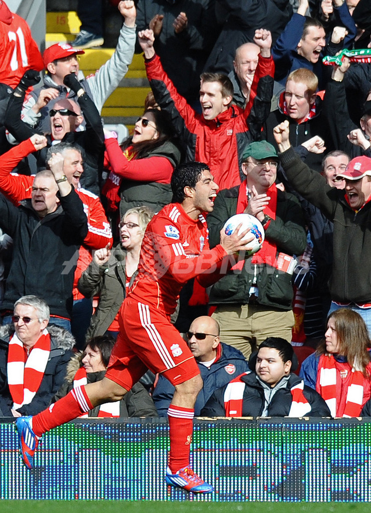 前半23分にオウンゴールで先制し歓喜するリバプールのルイス・スアレス(Luis Suarez、2012年3月3日撮影)。(c)AFP/PAUL ELLIS