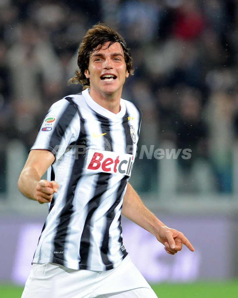 前半18分に先制点を挙げて歓喜するユベントスのパオロ・デ・チェッリェ(Paolo De Ceglie、2012年3月3日撮影)。(c)AFP/Tiziana Fabi