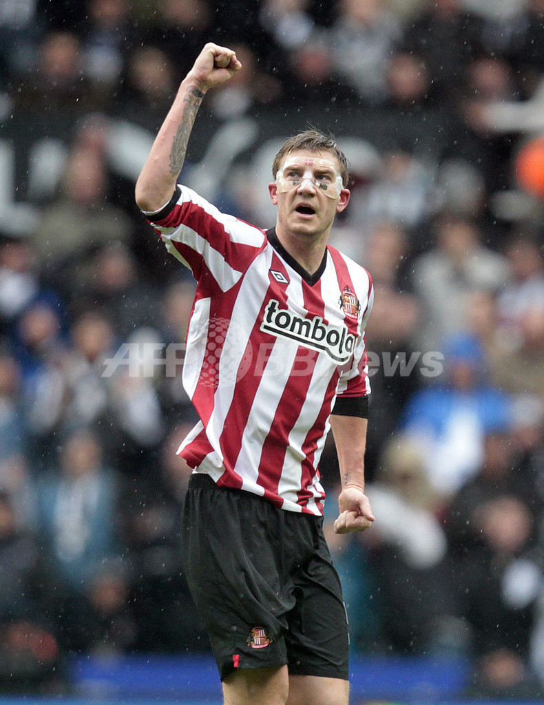 前半24分に先制点を挙げて歓喜するサンダーランドのニクラス・ベントナー(Nicklas Bendtner、2012年3月4日撮影)。(c)AFP/GRAHAM STUART