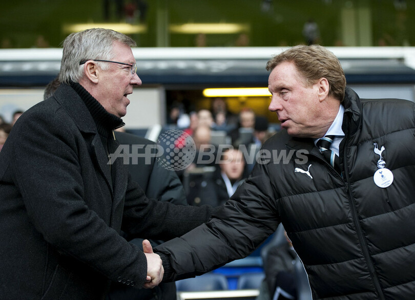 握手を交わすマンチェスター・ユナイテッドのアレックス・ファーガソン(Alex Ferguson)監督とトッテナム・ホットスパーのハリー・レドナップ(Harry Redknapp)監督(2012年3月4日撮影)。(c)AFP/ADRIAN DENNIS