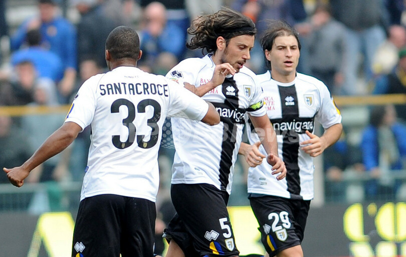 後半32分に同点ゴールを決め、チームメイトと喜びを分かち合うパルマのクリスチャン・ザッカルド(Christian Zaccardo、2012年3月4日撮影)。(c)AFP/Tiziana Fabi