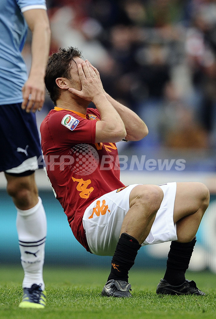 両手で顔を覆うASローマのフランチェスコ・トッティ(Francesco Totti、2012年3月4日撮影)。(c)AFP/Filippo MONTEFORTE