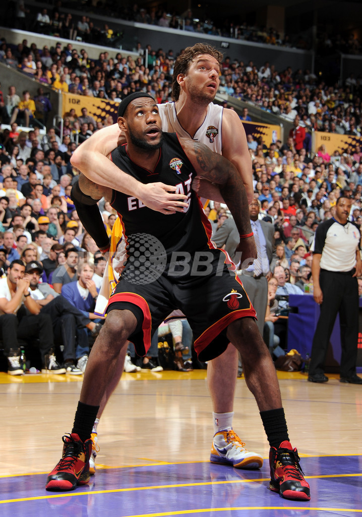 レイカーズのパウ・ガソル(Pau Gasol)とゴール下のポジションを争うヒートのレブロン・ジェームズ(LeBron James、2012年3月4日撮影)。(c)AFP/Getty Images/NBAE/Andrew D. Bernstein