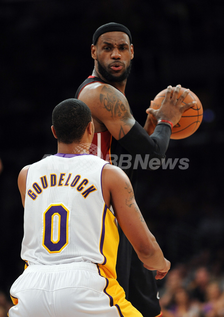 レイカーズのアンドリュー・グーデロック(Andrew Goudelock)のマークを受けるヒートのレブロン・ジェームズ(LeBron James、2012年3月4日撮影)。(c)AFP/Getty Images/NBAE/Noah Graham