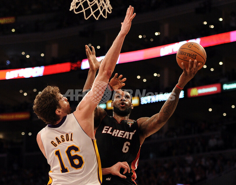 ヒートはレブロン・ジェームズ(LeBron James)が25得点13リバウンド7アシスト、ウェイドが16得点5アシスト4リバウンドを記録している。(c)AFP