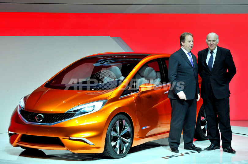 写真は、内覧会で5ドアの新型小型ハッチバック車を公開する日産自動車(Nissan Motor)のアンディ・パーマー(Andy Palmer)副社長(左)とビンス・ケーブル(Vince Cable)英民間企業相(右)(2012年3月6日撮影)。(c)AFP/SEBASTIEN FEVAL