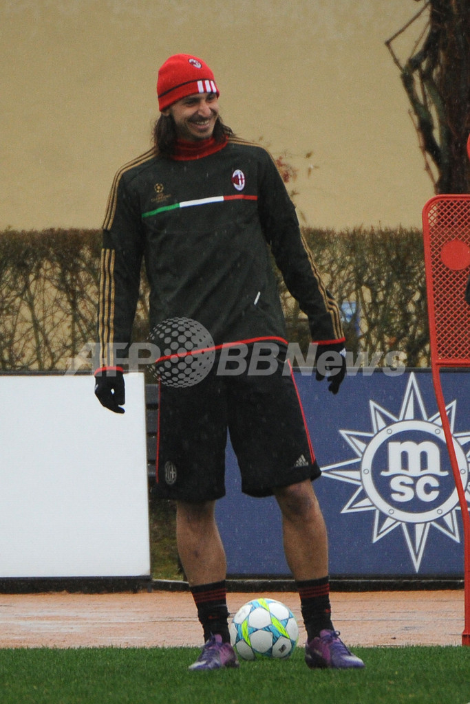 調整を行うACミランのズラタン・イブラヒモビッチ(Zlatan Ibrahimovic、2012年3月5日撮影)。(c)AFP/OLIVIER MORIN