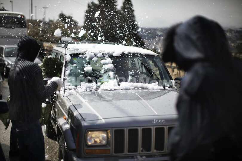 雪の降ったエルサレム(Jerusalem)やパレスチナ自治区ヨルダン川西岸(West Bank)のヘブロン(Hebron)。写真は、エルサレムで通行する車に雪玉を投げるパレスチナの若者たち(2012年3月2日撮影)。(c)AFP/MARCO LONGARI