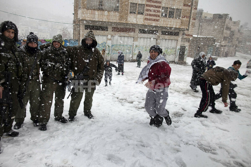 雪の降ったエルサレム(Jerusalem)やパレスチナ自治区ヨルダン川西岸(West Bank)のヘブロン(Hebron)。写真はヘブロンで、イスラエル国境警備隊の横で雪合戦をするパレスチナ人たち(2012年3月2日撮影)。(c)AFP/MENAHEM KAHANA