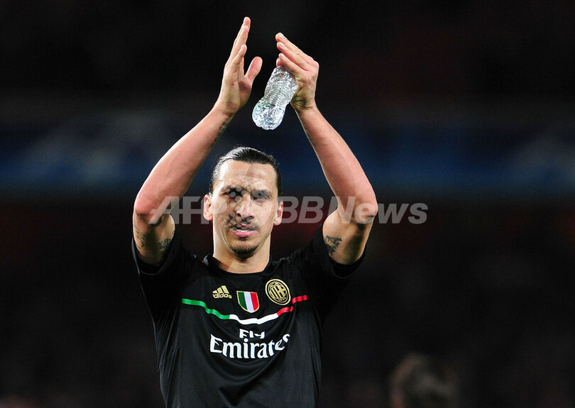準々決勝進出を決め、サポーターの歓声に応えるACミランのズラタン・イブラヒモビッチ(Zlatan Ibrahimovic、2012年3月6日撮影)。(c)AFP/GIUSEPPE CACACE