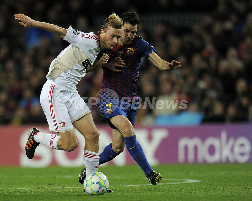 バイヤー・レバークーゼンのシモン・ロルフェス(Simon Rolfes、左)とボールを競るFCバルセロナのセスク・ファブレガス(Cesc Fabregas、2012年3月7日撮影)。(c)AFP/LLUIS GENE
