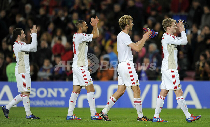 試合後にピッチを去るバイヤー・レバークーゼンの選手(2012年3月7日撮影)。(c)AFP/LLUIS GENE