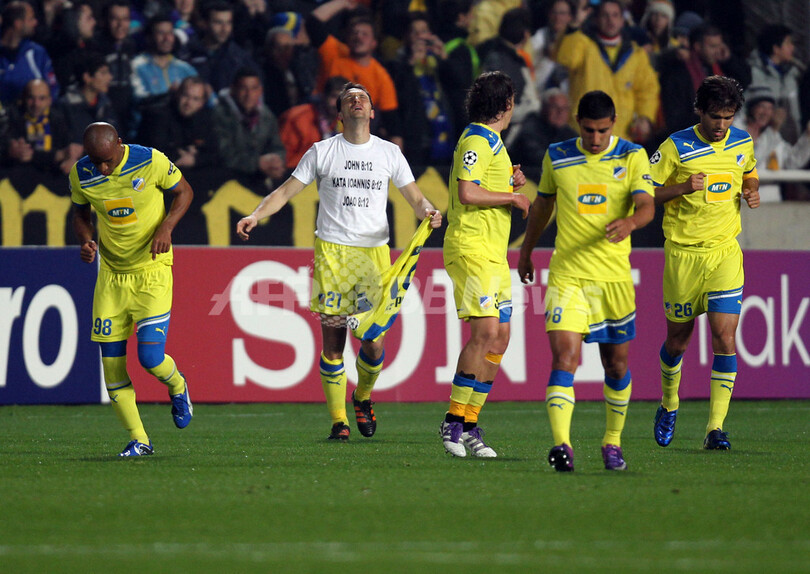 グループリーグではFCポルト(FC Porto)、ゼニト・サンクトペテルブルク(Zenit St. Petersburg)を破り、さらにリヨンから勝利を収めたアポエルは、今大会での準々決勝進出チームとしては、予算や名声では最小のクラブとなっている。(c)AFP/Charlie Charalambous