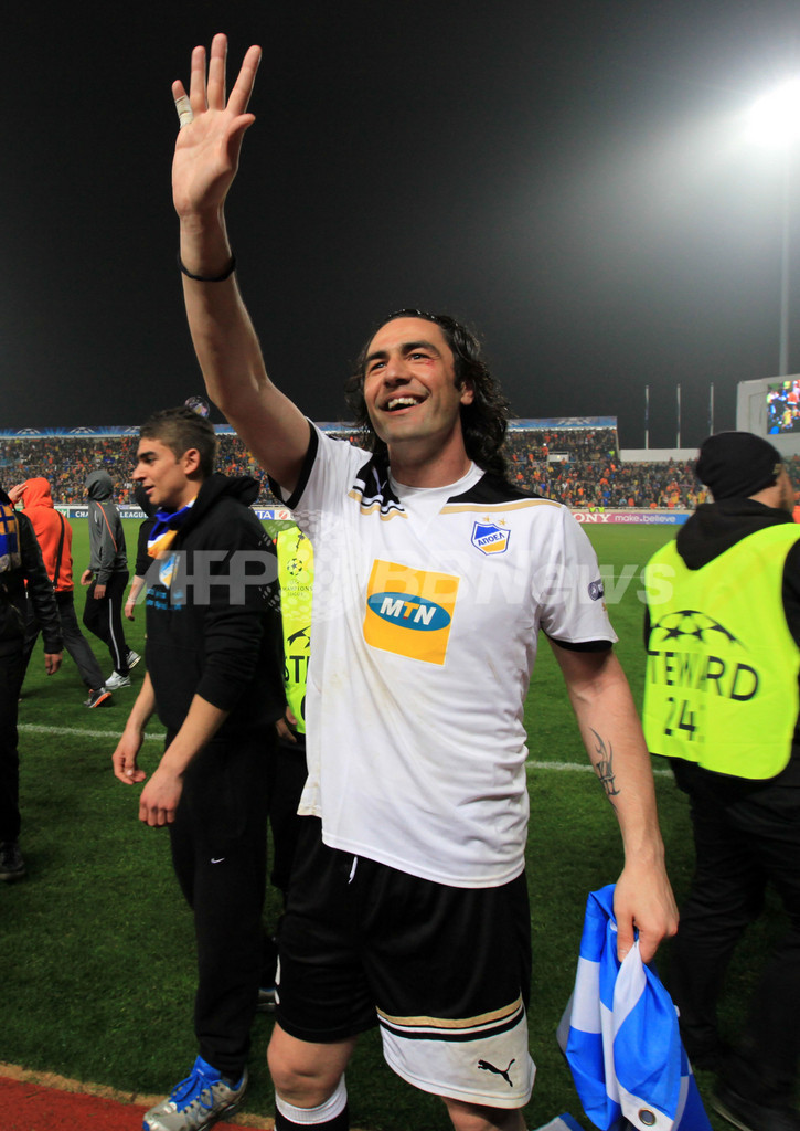 グループリーグではFCポルト(FC Porto)、ゼニト・サンクトペテルブルク(Zenit St. Petersburg)を破り、さらにリヨンから勝利を収めたアポエルは、今大会での準々決勝進出チームとしては、予算や名声では最小のクラブとなっている。(c)AFP/Charlie Charalambous