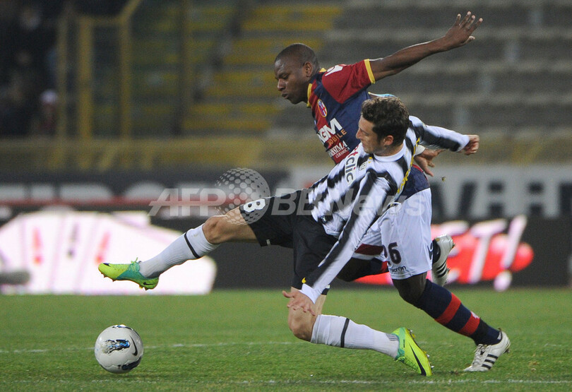 ボローニャのガビ・ムディンガイ(Gaby Mudingayi、左)とボールを競るユベントスのクラウディオ・マルキジオ(Claudio Marchisio、2012年3月7日撮影)。(c)AFP/OLIVIER MORIN
