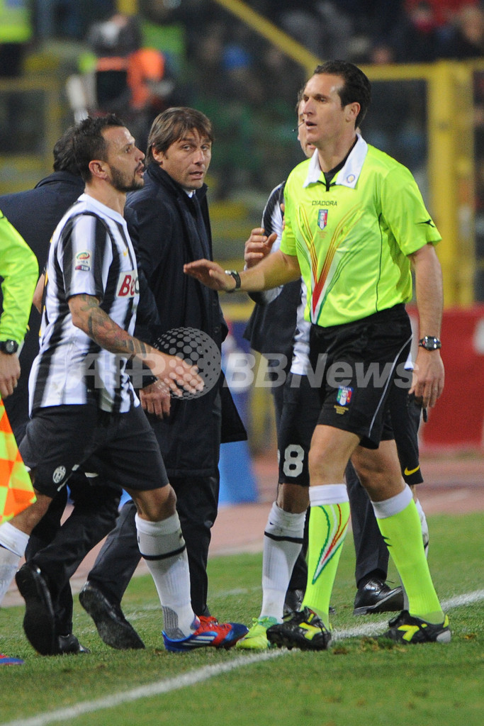 主審に退席を命じられるユベントスのアントニオ・コンテ監督(Antonio Conte、中央、2012年3月7日撮影)。(c)AFP/OLIVIER MORIN