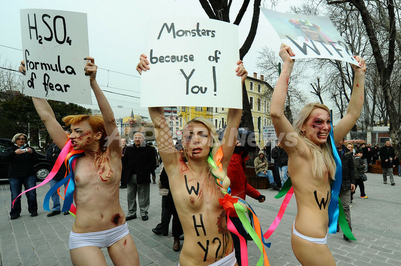 写真はトルコのイスタンブール(Istanbul)で、ドメスティックバイオレンスに抗議するウクライナの女性権利団体「FEMEN」のメンバー(2012年3月8日撮影)。(c)AFP/MUSTAFA OZER