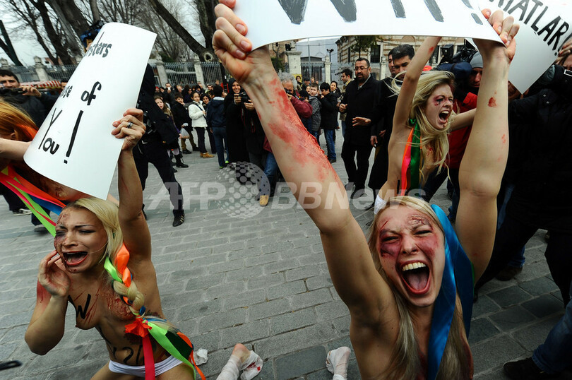 写真はトルコのイスタンブール(Istanbul)で、ドメスティックバイオレンスに抗議するウクライナの女性権利団体「FEMEN」のメンバー(2012年3月8日撮影)。(c)AFP/MUSTAFA OZER